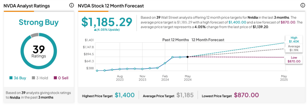 Turning to Wall Street, analysts have a Strong Buy consensus rating on NVDA stock based on 36 Buys and three Holds assigned in the past three months, as indicated by the graphic below. After a 201.03% rally in its share price over the past year, the average NVDA price target of $1,185 per share implies 4.05% upside potential.