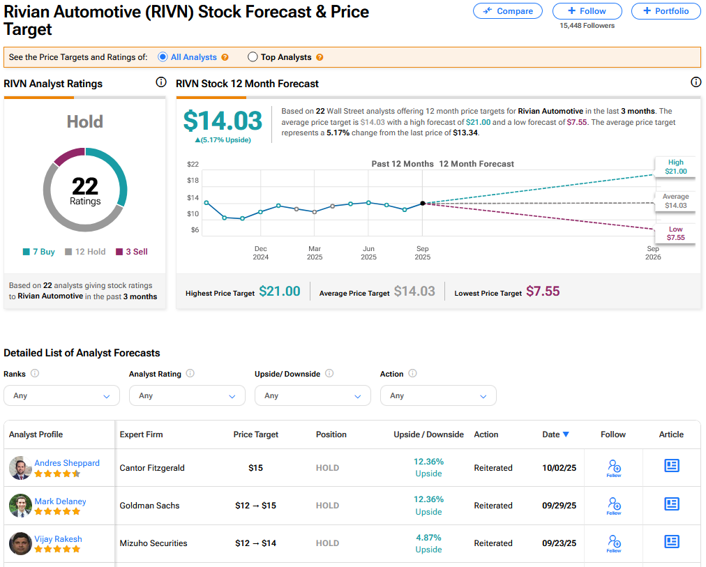 On TipRanks, RIVN has a Hold consensus based on 7 Buy, 12 Hold and 3 Sell ratings. Its highest price target is $21. RIVN stock’s consensus price target is $14.03, implying a 5.17% upside.