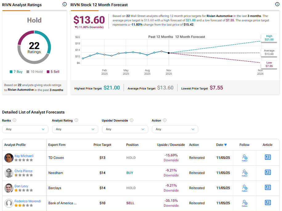 Turning to Wall Street, analysts have a Hold consensus rating on RIVN stock based on seven Buys, 10 Holds, and five Sells assigned in the past three months, as indicated by the graphic below. Furthermore, the average RIVN price target of $13.60 per share implies 11.80% downside potential.