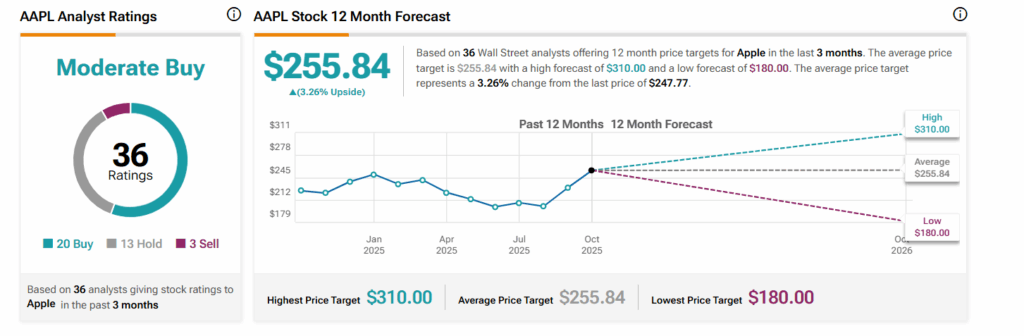 Turning to Wall Street, analysts have a Moderate Buy consensus rating on AAPL stock based on 20 Buys, 13 Holds, and three Sells assigned in the past three months, as indicated by the graphic below. Furthermore, the average AAPL price target of $255.84 per share implies 3.26% upside potential.