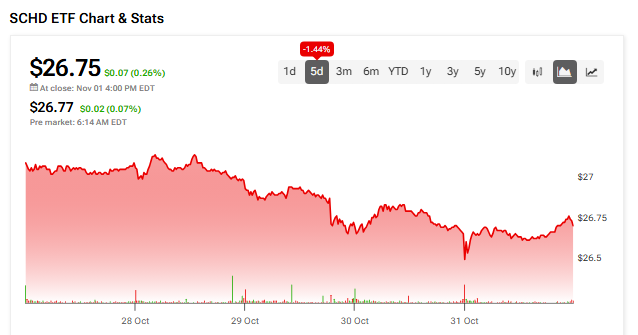Meanwhile, the SCHD is down 1.44% in the past five days but up 0.72% year-to-date.