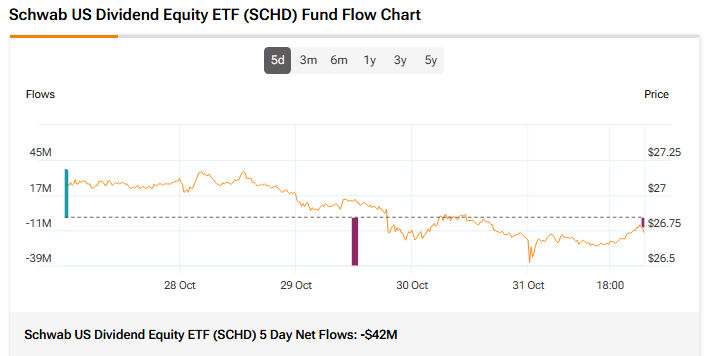 The SCHD ETF tracks the performance of high-dividend U.S. stocks from the Dow Jones U.S. Dividend 100 Index. According to TipRanks data, SCHD recorded 5-day net flows of about -$42 million, indicating that over the last five trading days, investors withdrew more money from the SCHD ETF than they added.