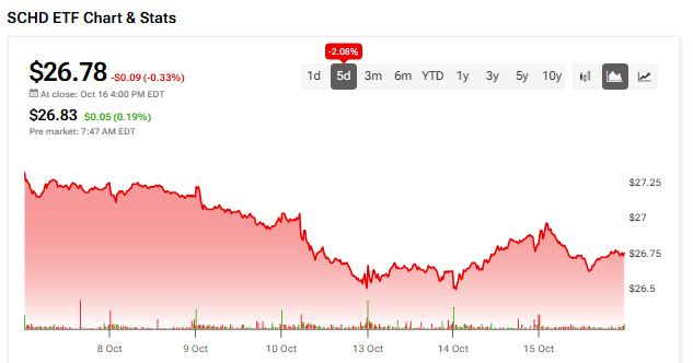 How is SCHD stock faring? The Schwab U.S. Dividend Equity ETF is down 2.08% in the past five days but up 1.17% year-to-date.
