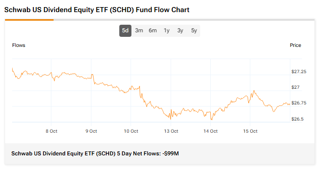 Meanwhile, its 5-day net flows totaled -$99 million, indicating that over the last five trading days, investors withdrew more money from the SCHD ETF than they added.
