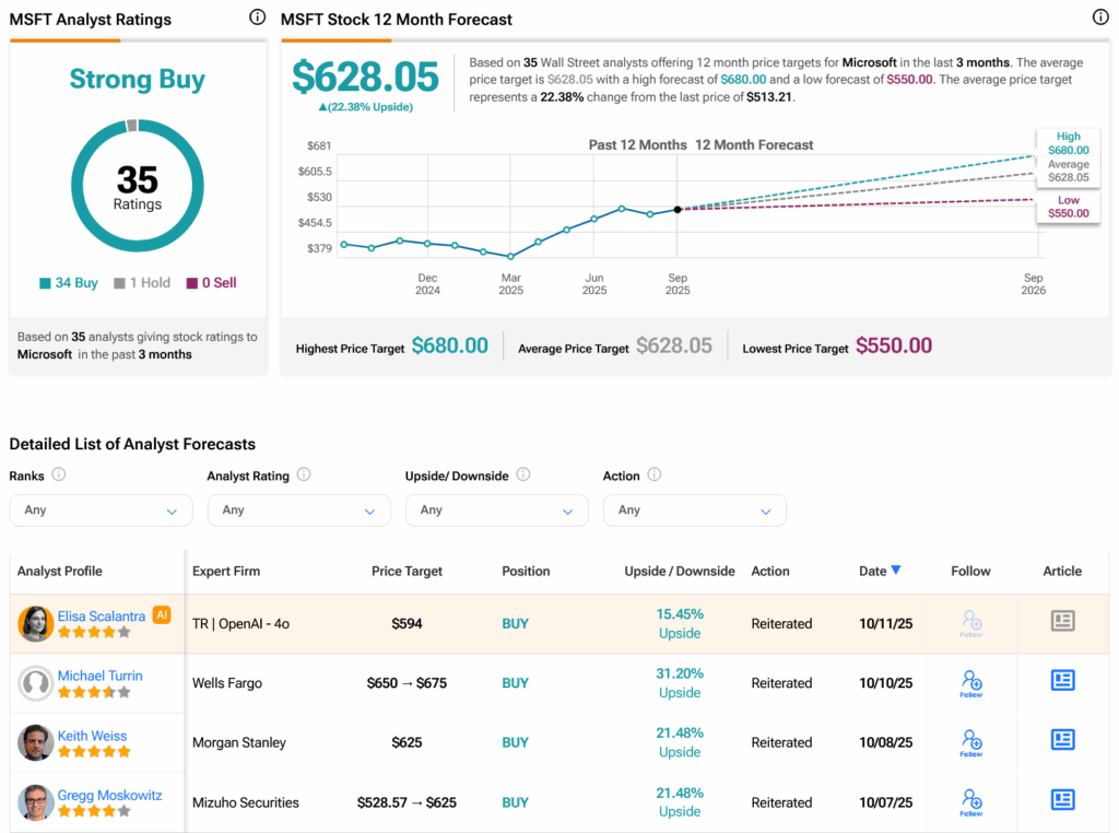 Turning to Wall Street, analysts have a Strong Buy consensus rating on MSFT stock based on 34 Buys and one Hold assigned in the past three months, as indicated by the graphic below. After a 21.91% rally in its share price over the past year, the average MSFT price target of $628.05 per share implies 22.38% upside potential.