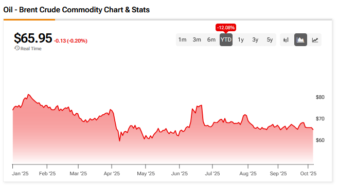 Indeed, the Brent Crude oil price has dropped by around 12% over the last 12 months hit by economic and geopolitical fears. – see below: