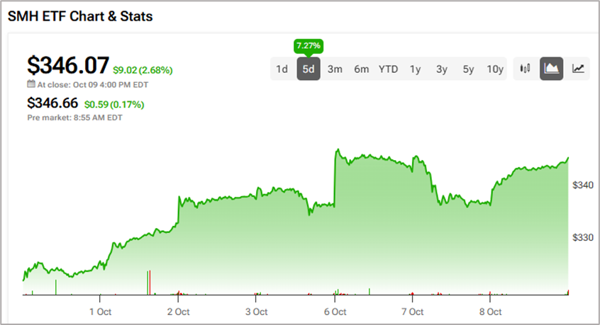 How is SMH stock faring? The VanEck Semiconductor ETF is up 7.3% in the past 5 days, and up 43% year-to-date.