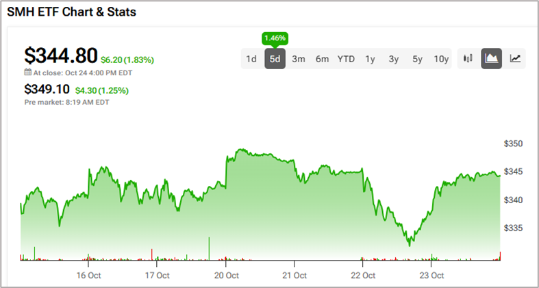 How is SMH stock faring? The VanEck Semiconductor ETF has gained 1.5% over the past five days and remains up 42% year-to-date.