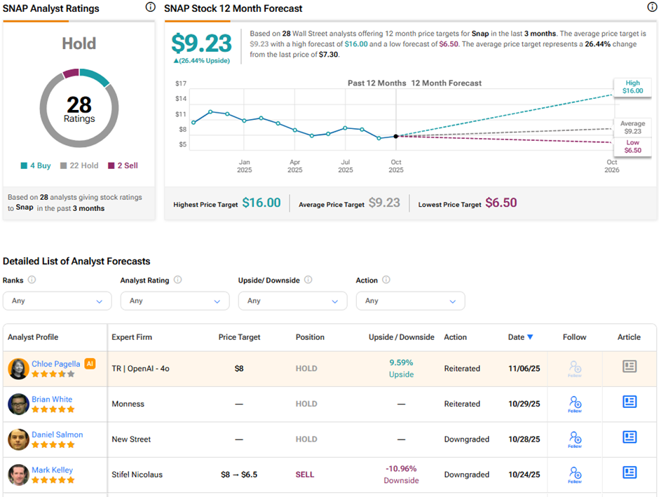 On TipRanks, SNAP stock has a Hold consensus rating based on four Buys, 22 Holds, and two Sell ratings. The average Snap price target of $9.23 implies 26.4% upside potential from current levels. Year-to-date, SNAP stock has lost 32.2%.