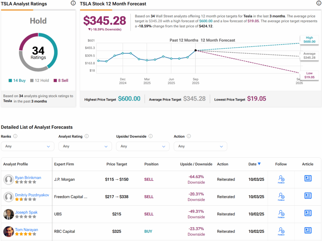 Turning to Wall Street, analysts have a Hold consensus rating on TSLA stock based on 14 Buys, 12 Holds, and eight Sells assigned in the past three months, as indicated by the graphic below. Furthermore, the average TSLA price target of $345.28 per share implies 18.6% downside risk.