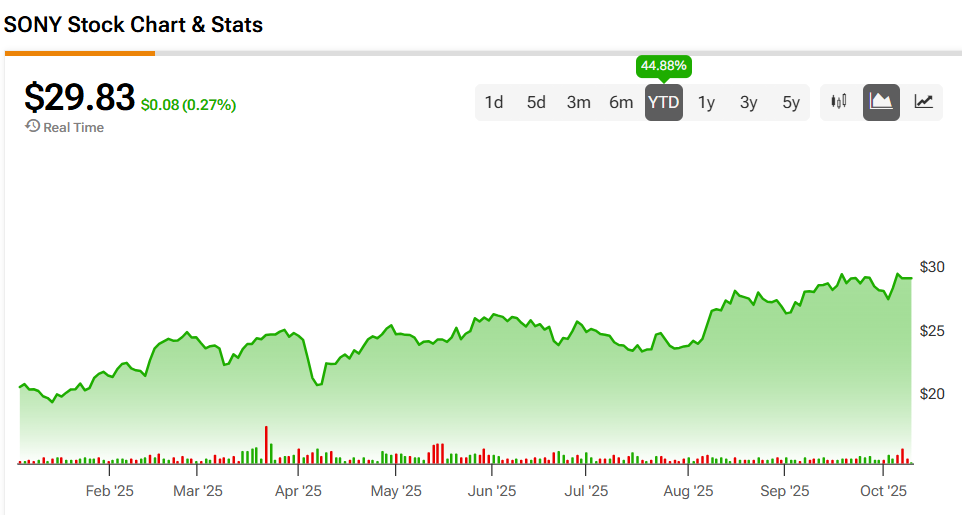 Sony stock was up 0.27% on Thursday, extending a 44.88% year-to-date rally. The shares have also climbed 57.74% over the past 12 months. Sony doesn’t just deal in video games, as it covers other avenues of entertainment, such as movies and music.