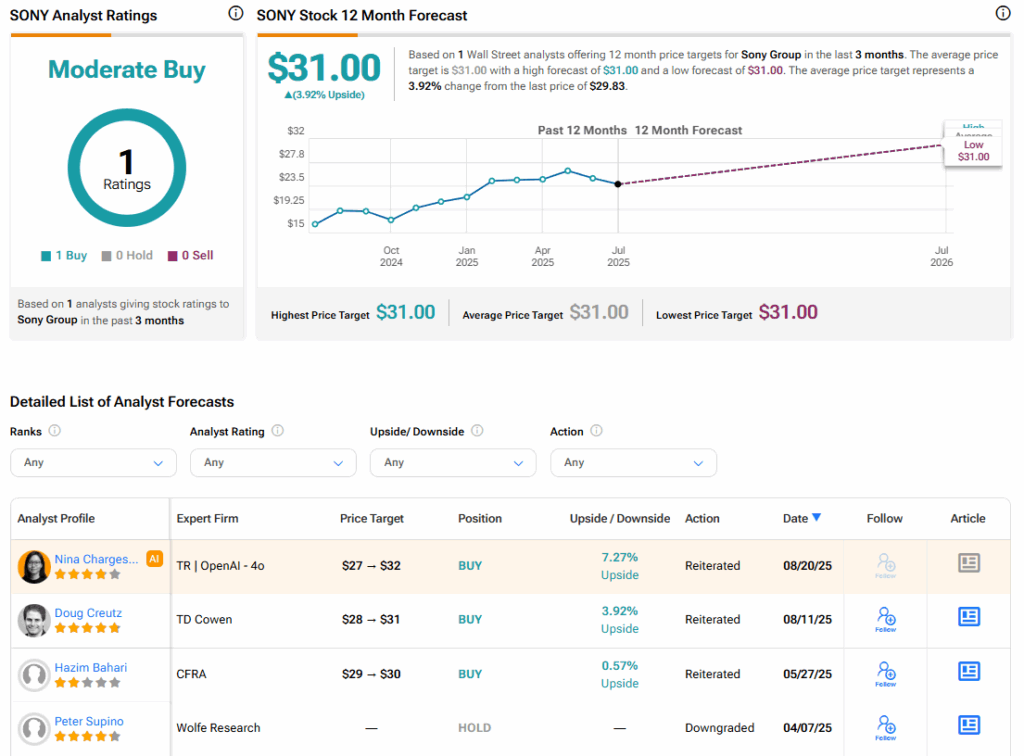 Turning to Wall Street, the analysts’ consensus rating for Sony is Moderate Buy, based on one Buy rating over the past three months. With that comes a $31 price target for SONY stock, representing a potential 3.92% upside for the shares.