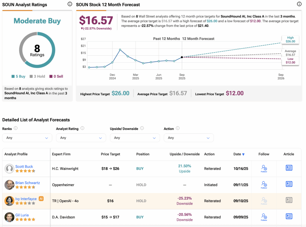 According to TipRanks, SOUN stock has received a Moderate Buy consensus rating, with five Buys and three Holds assigned in the last three months. The average SoundHound stock price target is $16.57, suggesting a potential downside of 22.57% from the current level.