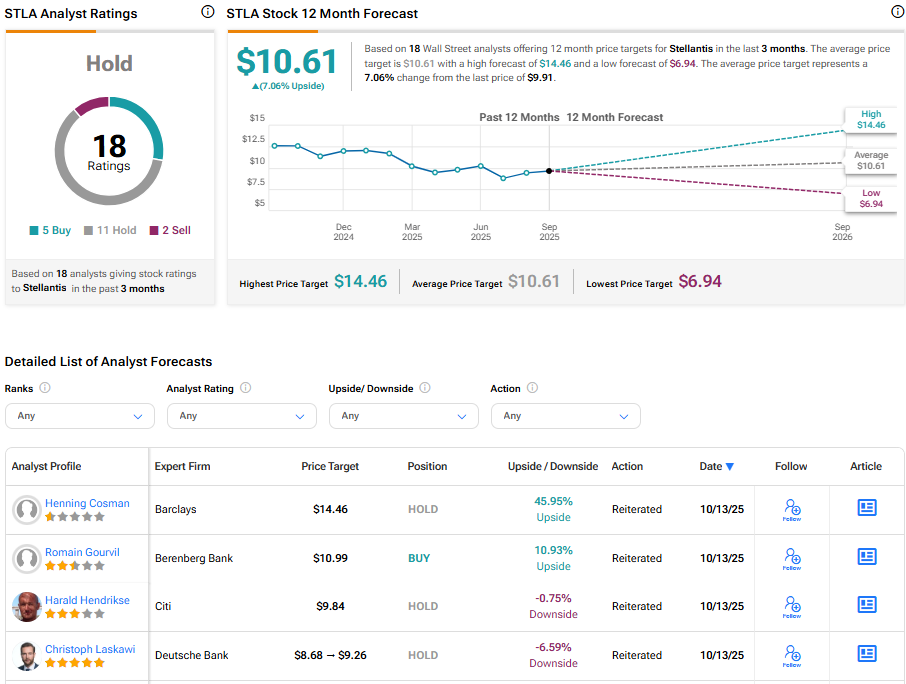 Turning to Wall Street, STLA stock has a Hold consensus rating based on five Buys, 11 Holds, and two Sells assigned in the last three months. At $10.61, the average Stellantis stock price target implies a 7.06% upside potential.