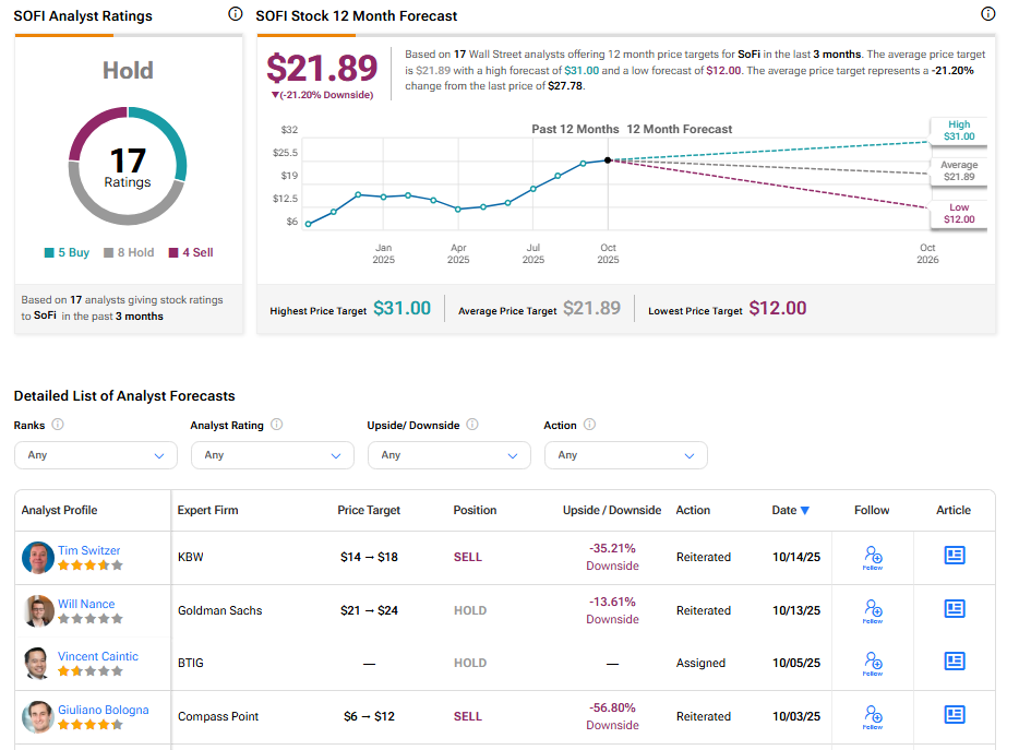 Currently, Wall Street is sidelined on SoFi Technologies stock, with a Hold consensus rating based on five Buys, eight Holds, and four Sell recommendations. The average SOFI stock price target of $21.89 indicates a possible downside of 21.91% from current levels.