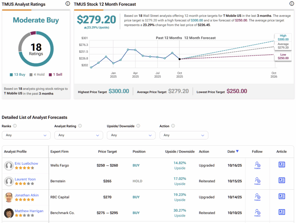 According to TipRanks, T-Mobile holds a Moderate Buy consensus rating based on 18 analyst reviews, with 13 Buys, 4 Holds, and 1 Sell. TMUS’s average stock price target is $279.20, implying 23% upside over the next 12 months.