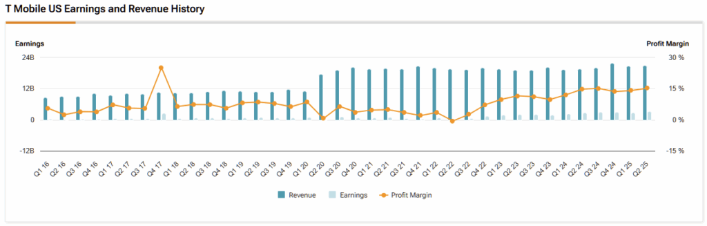 The July commercial launch of T-Satellite, which initially supports text messaging with voice and data expected to follow, further strengthens T-Mobile’s value proposition. The service expands coverage to remote areas and could boost demand for higher-tier plans. The company’s leadership in nationwide 5G deployment — widely recognized as the most advanced in the U.S. — continues to provide a clear competitive edge.