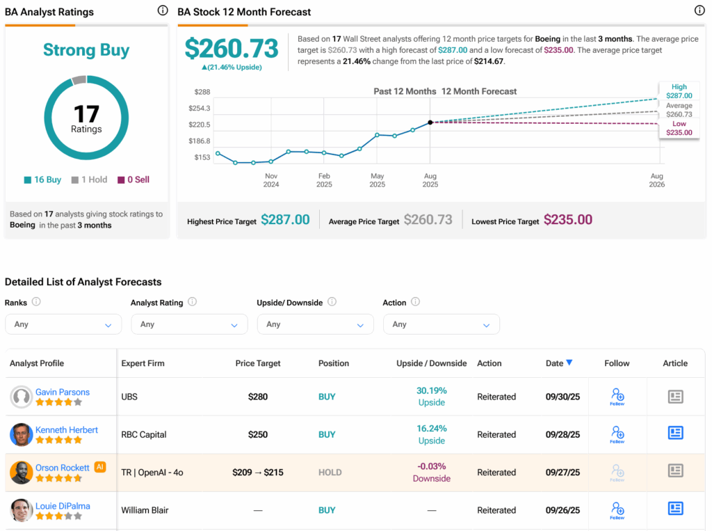 Turning to Wall Street, analysts have a Strong Buy consensus rating on BA stock based on 16 Buys and one Hold assigned in the past three months, as indicated by the graphic below. After a 40.76% rally in its share price over the past year, the average BA price target of $260.73 per share implies 21.46% upside potential.