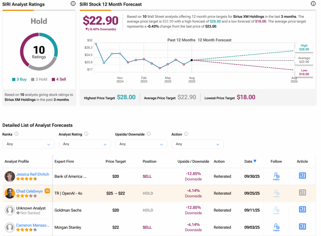 Turning to Wall Street, analysts have a Hold consensus rating on SIRI stock based on three Buys, three Holds, and four Sells assigned in the past three months, as indicated by the graphic below. After a 0.13% rally in its share price over the past year, the average SIRI price target of $22.90 per share implies 0.43% downside risk.