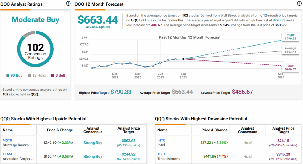 Turning to Wall Street, analysts have a Moderate Buy consensus rating on QQQ stock based on 90 Buys, 12 Holds, and zero Sells assigned in the past three months, as indicated by the graphic below. Furthermore, the average QQQ price target of $663.44 per share implies 9.5% upside potential.