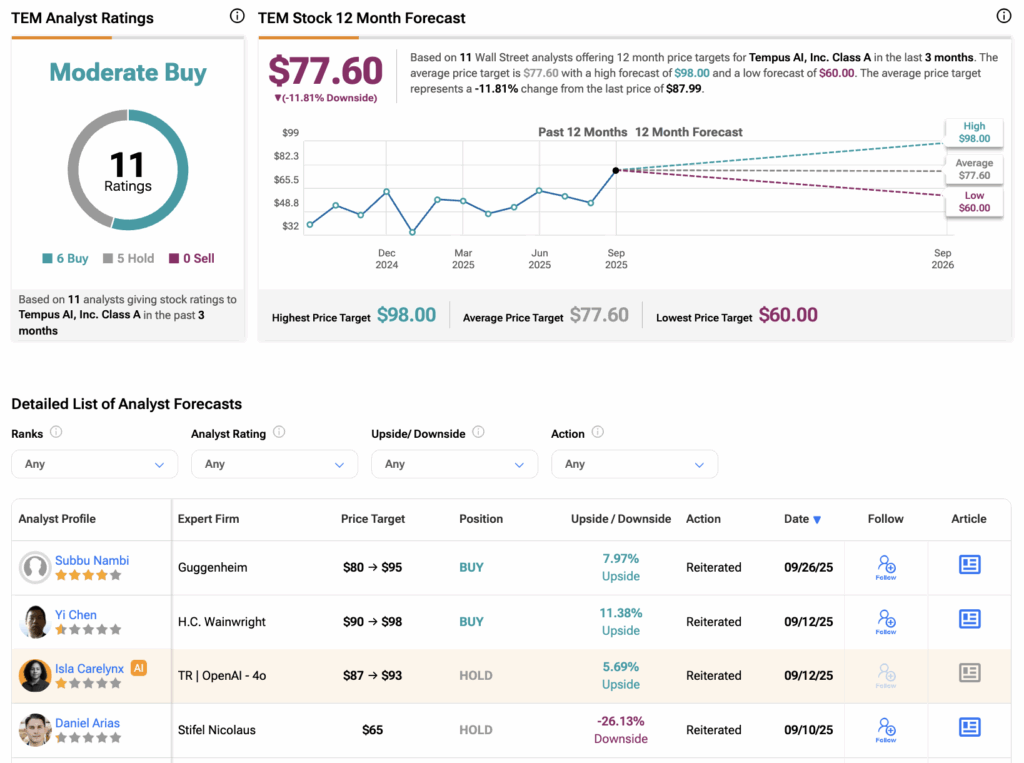 On TipRanks, TEM stock has received a Moderate Buy rating based on six Buy and five Hold recommendations. The Tempus AI share price forecast is $77.60, which implies a decline of 11.81% from the current level.
