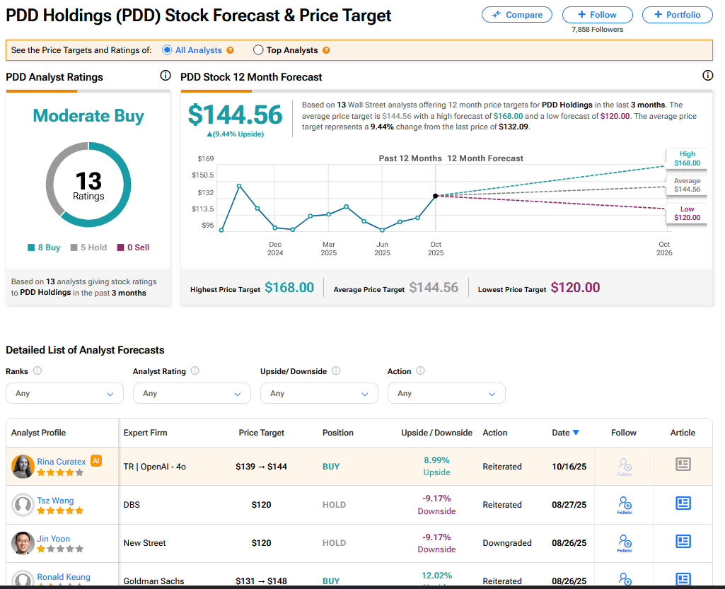 On TipRanks, PDD has a Moderate Buy consensus based on 8 Buy and 5 Hold ratings. Its highest price target is $168. PDD stock’s consensus price target is $144.56, implying a 9.46% upside.