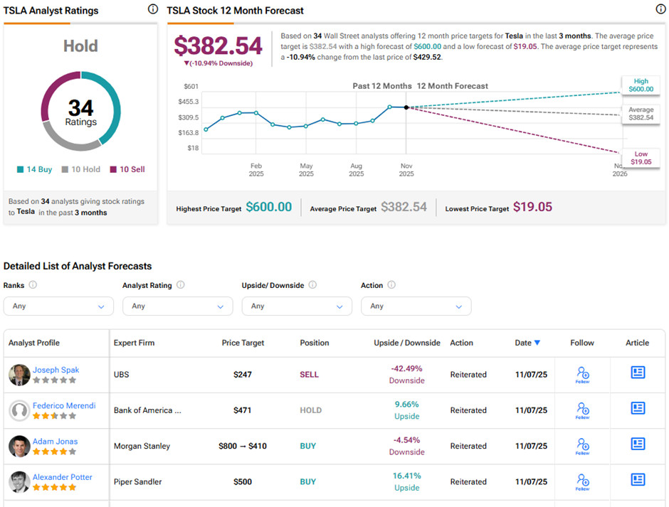 On TipRanks, TSLA stock has a Hold consensus rating based on 14 Buys, 10 Holds, and 10 Sell ratings. The average Tesla price target of $382.54 implies 10.9% downside potential from current levels. Year-to-date, Tesla stock has gained 6.4%.