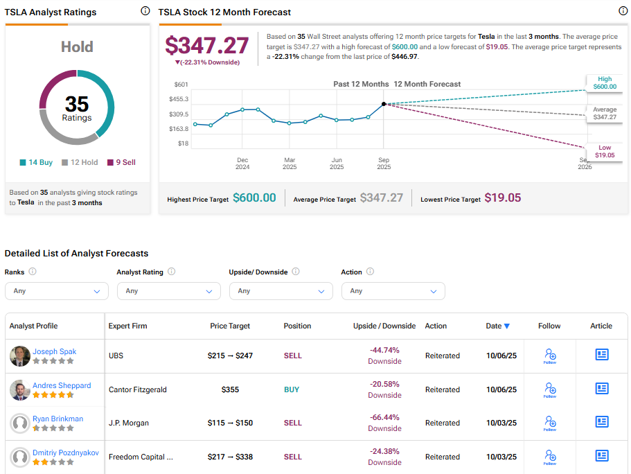Turning to Wall Street, TSLA stock has a Hold consensus rating based on 14 Buys, 12 Holds, and nine Sells assigned in the last three months. At $347.27, the average Tesla price target implies a 22.4% downside risk. The stock has gained 84.3% over the past six months.