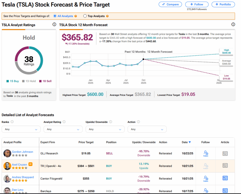 On TipRanks, TSLA has a Hold consensus based on 15 Buy, 13 Hold and 10 Sell ratings. Its highest price target is $600. TSLA stock’s consensus price target is $365.82, implying a 17.35% downside.