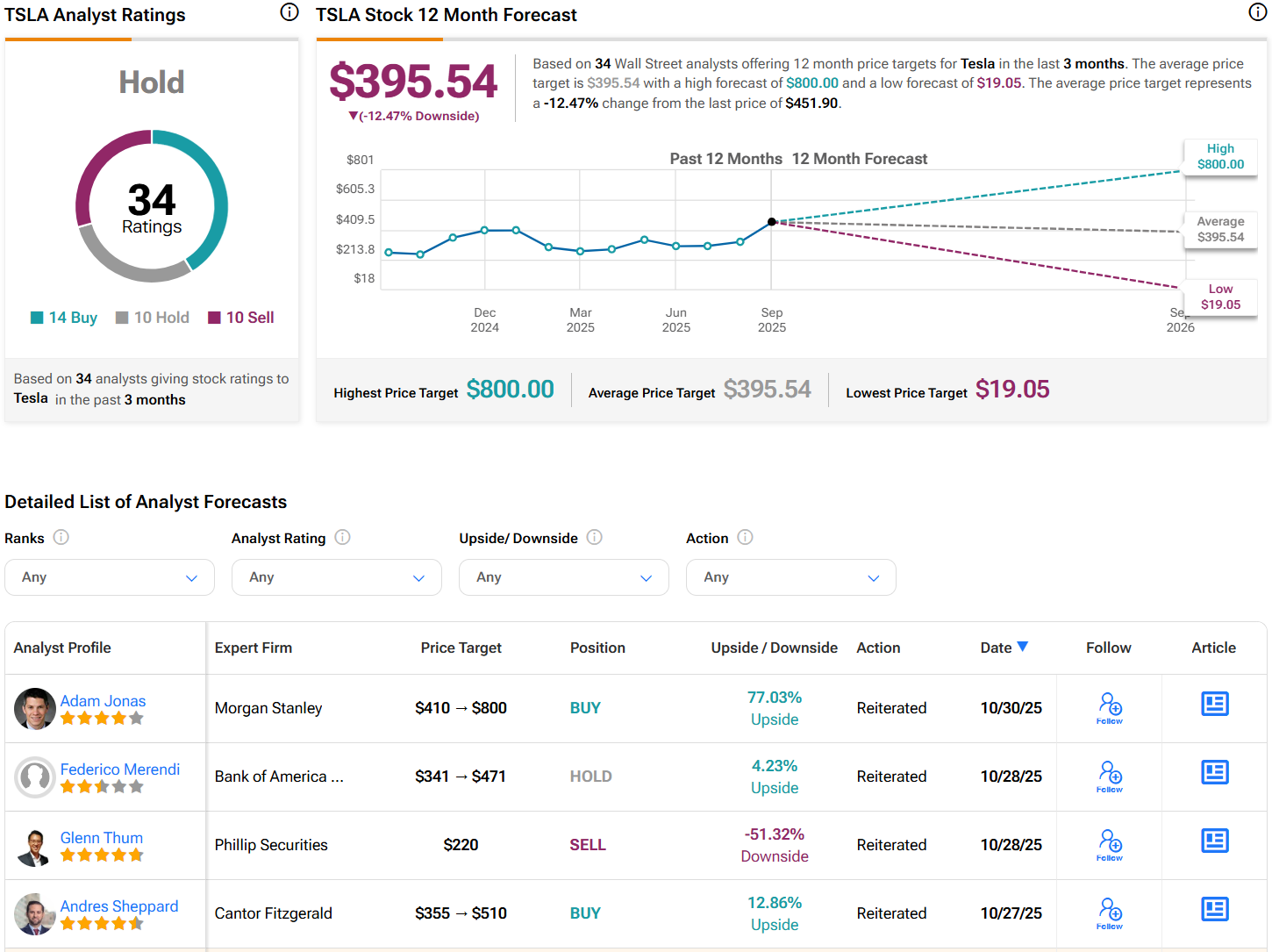 Turning to Wall Street, analysts have a Hold consensus rating on Tesla stock based on 14 Buys, 11 Holds, and 10 Sells assigned in the past three months, as indicated by the graphic below. Furthermore, the average Tesla price target of $395.54 per share implies 12.5% downside risk.