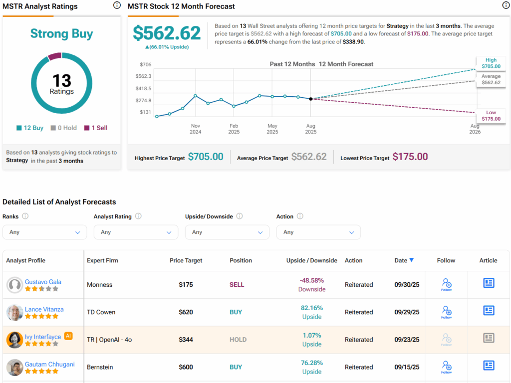 Turning to Wall Street, analysts have a Strong Buy consensus rating on MSTR stock based on 12 Buys, zero Holds, and one Sell assigned in the past three months, as indicated by the graphic below. Furthermore, the average MSTR price target of $562.62 per share implies 66% upside potential.