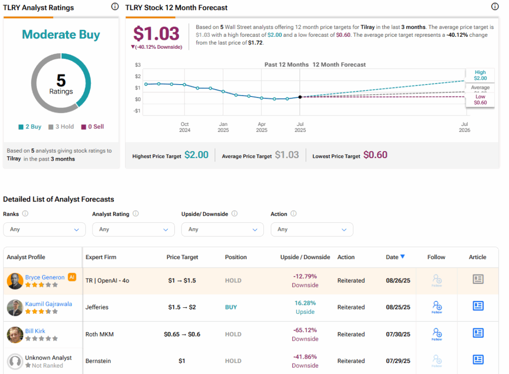 Turning to Wall Street, the analysts’ consensus rating for Tilray is Moderate Buy, based on two Buy and three Hold ratings over the past three months. With that comes an average TLRY stock price target of $1.03, representing a potential 40.12% downside for the shares. These ratings and price targets will likely change as analysts update their coverage after today’s earnings report.