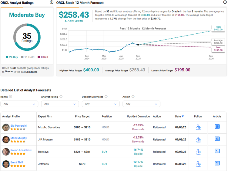 Heading into Q1 FY26 earnings, Wall Street has a Moderate Buy consensus rating on Oracle stock, based on 24 Buys and 11 Holds. The average ORCL stock price target of $258.43 indicates 7.4% upside potential from current levels.