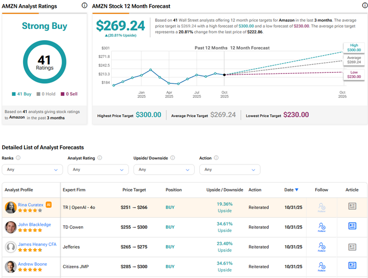 With 41 unanimous Buys, Wall Street has a Strong Buy consensus rating on AMZN stock. The average AMZN stock price target of $269.24 indicates 21% upside potential.