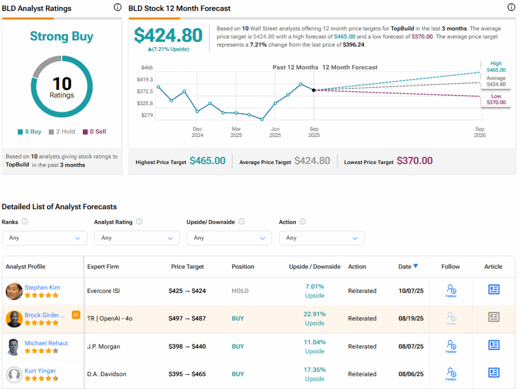 Turning to Wall Street, the analysts’ consensus rating for TopBuild is Strong Buy, based on eight Buy and two Hold ratings over the past three months. With that comes an average BLD stock price target of $424.80, representing a potential 7.21% upside for the shares.