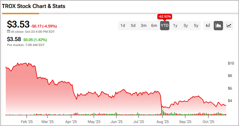 The information became clear on July 30, 2025, when Tronox released its second-quarter fiscal 2025 results. The company reported a sharp drop in TiO2 sales, citing a weak coatings season and increased competition. As a result, Tronox lowered its fiscal 2025 revenue forecast and cut its dividend by 60% from $0.13 per share to $0.05 per share. Following the news, TROX stock slumped nearly 38%.
