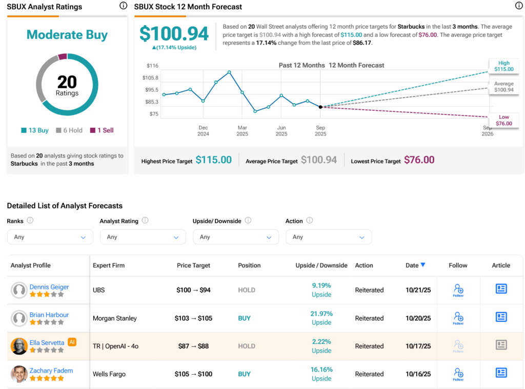 Turning to Wall Street, analysts have a Moderate Buy consensus rating on SBUX stock based on 13 Buys, six Holds and one Sell assigned in the past three months, as indicated by the graphic below. After a 12.69% loss in its share price over the past year, the average SBUX price target of $100.94 per share implies 17.14 % upside potential.