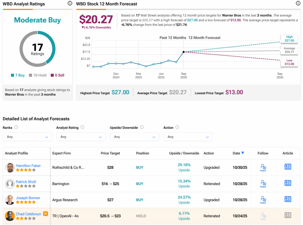 Turning to Wall Street, analysts have a Moderate Buy consensus rating on WBD stock based on seven Buys and 10 Holds assigned in the past three months, as indicated by the graphic below. After a 162.48% rally in its share price over the past year, the average WBD price target of $20.27 per share implies 6.76% downside risk.