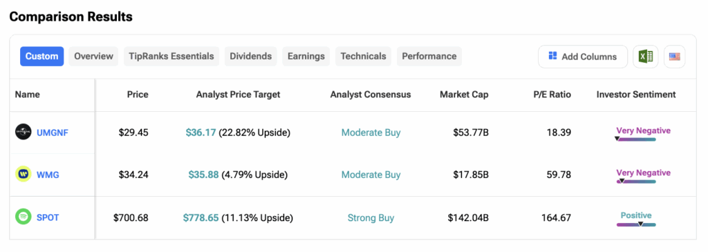 Using TipRanks’ Stocks Comparison Tool, we compared music stocks to see which ones analysts favor.