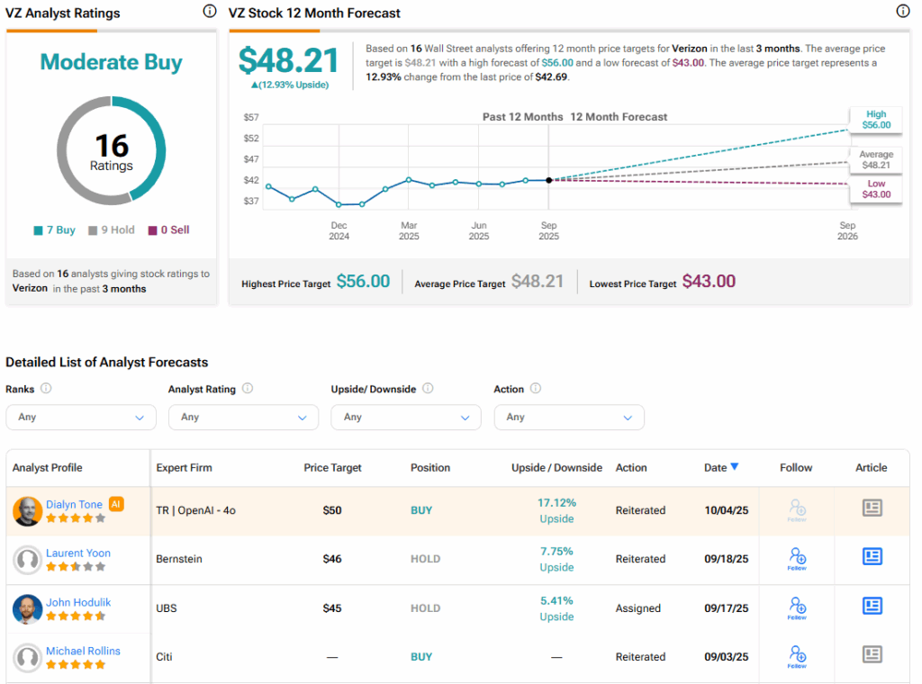 Turning to Wall Street, the analysts’ consensus rating for Verizon is Moderate Buy, based on seven Buy and nine Hold ratings over the past three months. With that comes an average VZ stock price target of $48.21, representing a potential 12.93% upside for the shares.
