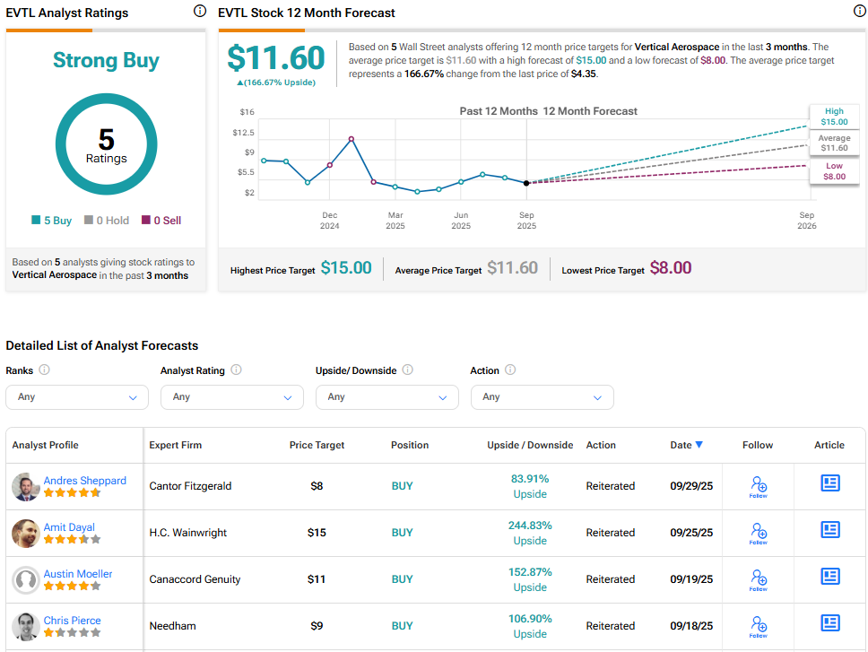 As stated above, Vertical Aerospace boasts a Strong Buy consensus rating, based on five analysts. The average EVTL stock price target stands at $11.60, implying a 166.67% upside from the current price.