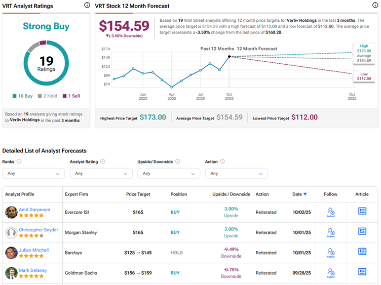 Wall Street has a Strong Buy consensus rating on Vertiv Holdings stock based on 16 Buys, two Holds, and one Sell recommendation. The average VRT stock price target of $154.59 indicates a possible downside of 3.5% from current levels.