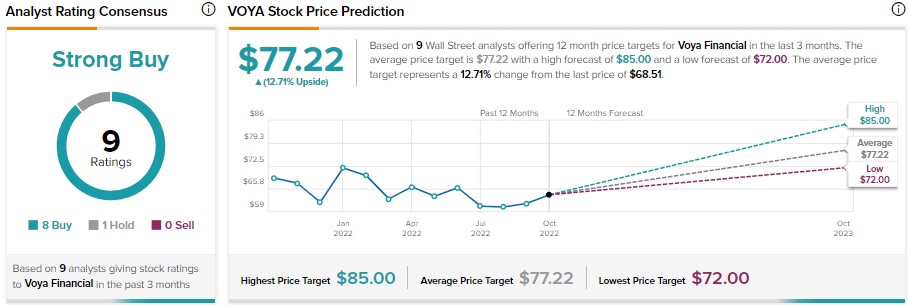 VOYA stock has a Strong Buy consensus rating on TipRanks based on eight Buy and one Hold recommendations. VOYA’s average price target of $77.22 implies 12.71% upside potential. Its strong organic growth, margin expansion, and capital management initiatives will likely cushion its earnings.