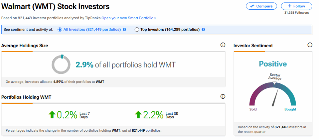 Looking at the Crowd Wisdom page, we see that 2.9% of 821,449 investor portfolios analyzed by TipRanks now hold WMT stock. Over the last 30 days 2.2% more portfolios held WMT stock, with a 0.2% increase in the last 7 days.