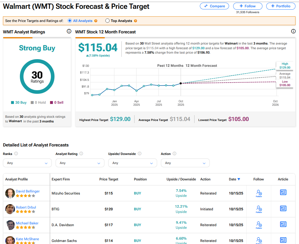 On TipRanks, WMT has a Strong Buy consensus based on 30 Buy ratings. Its highest price target is $129. WMT stock’s consensus price target is $115.04, implying a 7.58% upside.