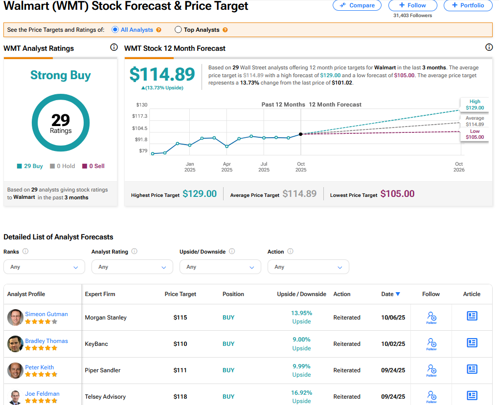 On TipRanks, WMT has a Strong Buy consensus based on 29 Buy ratings. Its highest price target is $129. WMT stock’s consensus price target is $114.89, implying a 13.72% upside.