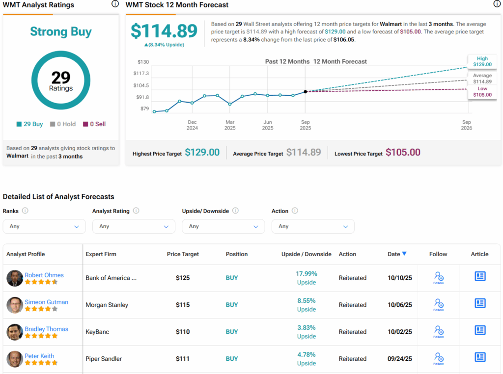 Turning to Wall Street, analysts have a Strong Buy consensus rating on WMT stock based on 29 Buys assigned in the past three months, as indicated by the graphic below. Furthermore, the average WMT price target of $114.89 per share implies 8.3% upside potential.