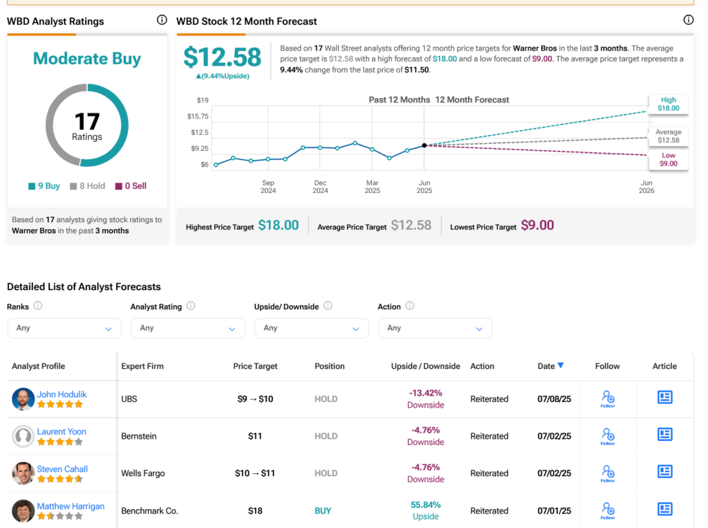 Turning to Wall Street, analysts have a Moderate Buy consensus rating on WBD stock based on nine Buys and eight Holds assigned in the past three months, as indicated by the graphic below. After a 55.87% rally in its share price over the past year, the average WBD price target of $12.58 per share implies 9.44% upside potential.