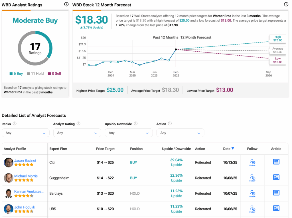 Turning to Wall Street, analysts have a Moderate Buy consensus rating on WBD stock based on five Buys and 11 Holds assigned in the past three months, as indicated by the graphic below. After a 133.95% rally in its share price over the past year, the average WBD price target of $17.82 per share implies 1.78% upside potential.