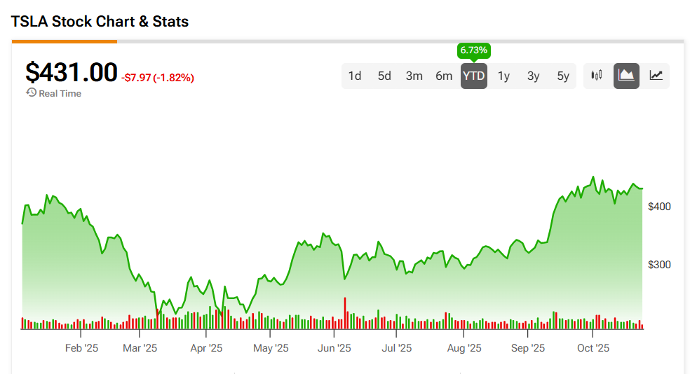 Tesla stock was down 1.82% on Thursday but remained up 6.73% year-to-date. The stock has also rallied 68.52% over the past 12 months. Trading activity today included some 46.9 million shares, compared to a three-month daily average of about 94.7 million units.